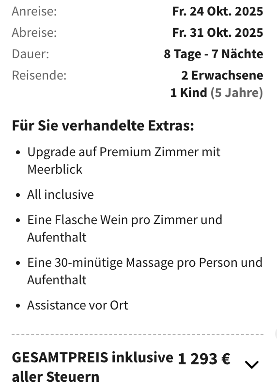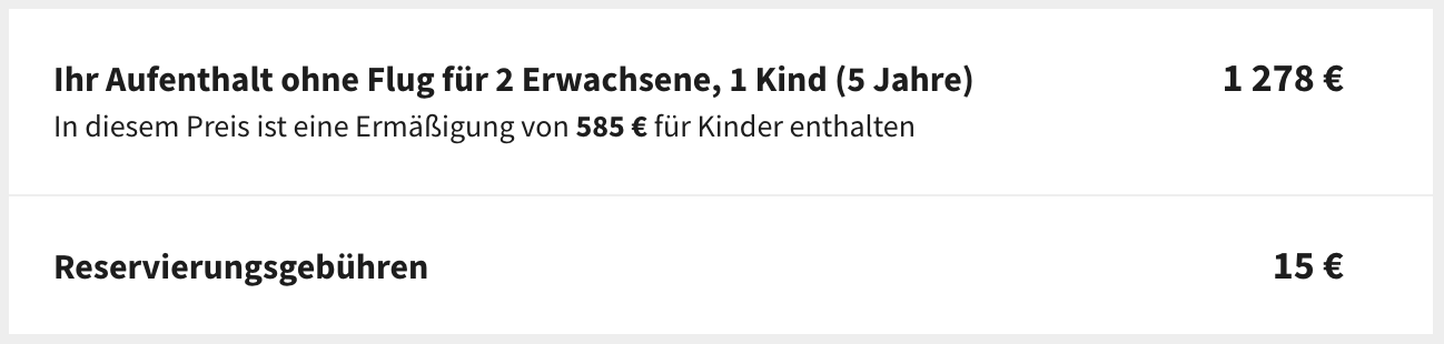 🧸 Zwei Erwachsene und 1 Kind unter 12 Jahren zahlen einen Gesamtpreis von 1.293€! Dabei ist eine Ermäßigung von 585€ für das Kind einberechnet!