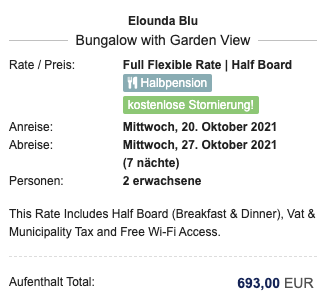 bis 7 Tage vor Abreise kostenlos stornieren und bekommt eine Gutschrift auf euer Mitgliedskonto (abzüglich der Reservierungskosten: 35 € bei Buchungen unter 700 € und 65 € bei Buchungen ab 700 €)