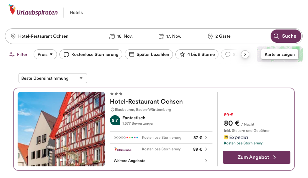 Als Unterkunft haben wir euch das 3* Hotel Ochsen im Zentrum ausgesucht, da es nicht nur top bewertet, sondern auch noch äußerst praktisch gelegen ist. So seid ihr in weniger als 10 Minuten zu Fuß am Blautopf und innerhalb 30 Minuten mit dem Auto oder dem Zug in Ulm. Das Frühstück bekommt ihr gegen einen Aufpreis, außerdem könnt ihr bis kurz vor knapp kostenlos stornieren. Privatparkplätze gibt es ebenfalls vor Ort, zudem gehört ein Restaurant zum Hotel dazu. Haustiere sind auch gestattet, ggf. gegen eine Gebühr.