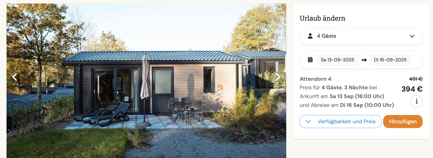 Jeder der Parks hat verschiedene Ferienhäuser in verschiedenen Größen. Die Zahl hinter der jeweiligen Unterkunft gibt die maximale Personenzahl an. Dank der vielen Filter-Möglichkeiten (Personenzahl, Haustiere, Ausstattung, Preisspanne etc.) könnt ihr oben rechts ganz einfach nach den günstigsten oder beliebtesten Angeboten filtern.