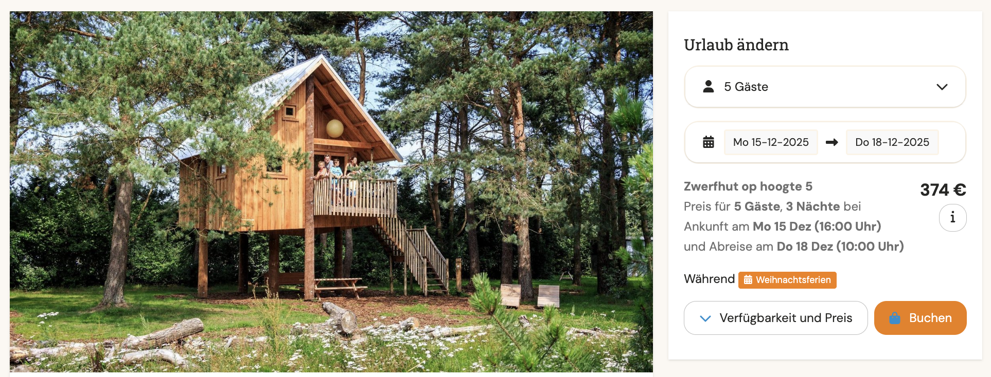 Für 3 Nächte im gemütlichen Haus auf Stelzen mit Schaukel und Pelletofen zahlt ihr im Dezember nur 75€ pro Person, wenn ihr zu fünft anreist (Gesamtpreis 374€). Wenn ihr mit weniger Personen anreist, reduziert sich der Gesamtpreis entsprechend. Bettwäsche, Endreinigung und Kurtaxe sind bereits inklusive. ✔️