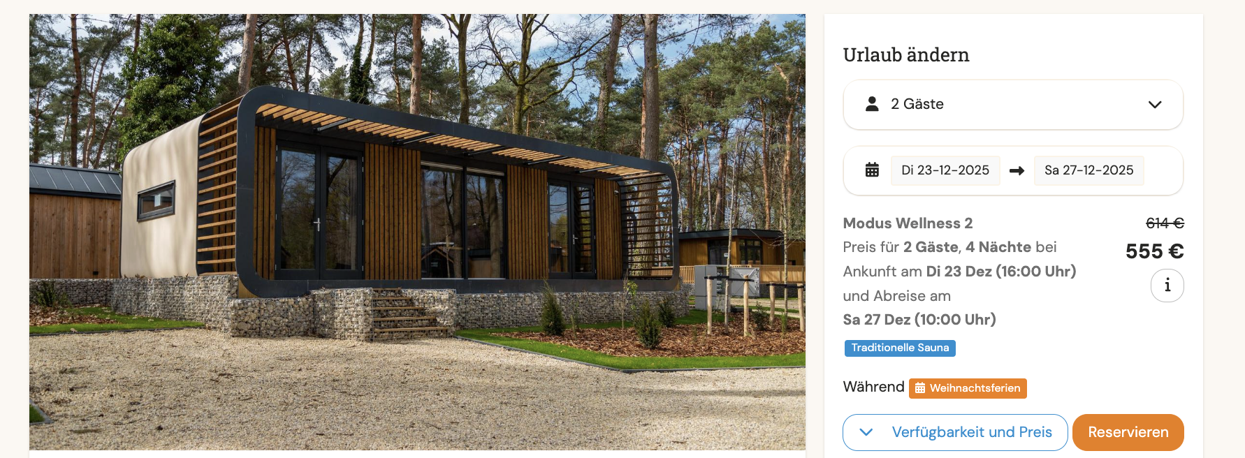 Der Modus Wellness 2 erinnert an ein luxuriöses Hotelzimmer mit herrlichen Wellnesseinrichtungen. Das freistehende und ebenerdige Chalet ist für 2 Personen geeignet. Der Wohn-/Schlafraum ist gemütlich eingerichtet und verfügt über ein Doppelbett, eine Sitzecke mit Fernseher, einen Essbereich und eine Küche mit Geschirrspüler, Kühlschrank und einer Filterkaffeemaschine. Das Badezimmer hat eine Badewanne, eine geräumige Dusche, eine Infrarotsauna und eine separate Toilette. Der Parkplatz und WLAN sind kostenlos. Es ist nicht möglich, ein Baby-/Kinderbett aufzustellen.
