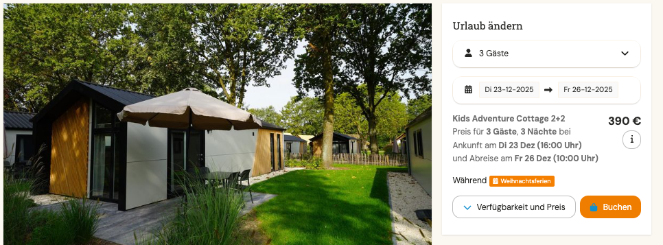 Der Ferienpark selber ist sehr beliebt und bietet u.a. ein Hallenbad und Indoor-Spielplatz. Für 3 Nächte im Kids Adventure Cottage zahlt ihr zu dritt ab 390€. Für 4 Nächte zahlt ihr nun einen Aufschlag von 60€. 🥳