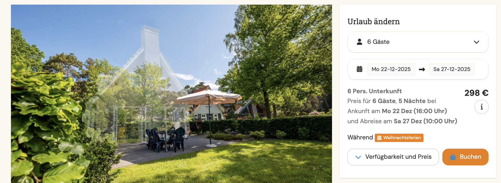 Anreisen könnt ihr das ganze Jahr über – auch in den Schulferien und über die Feiertage. Für 5 Nächte über Weihnachten zahlt ihr z.B. nur 49€ pro Person im Ferienhaus zu sechst (Gesamtpreis 298€). 🎄