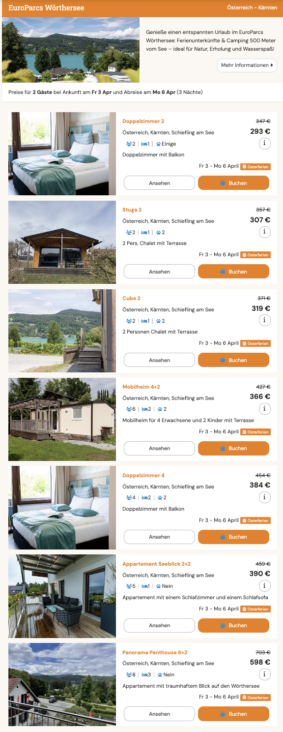 Tipp: Jeder der Parks hat verschiedene Ferienhäuser in verschiedenen Größen. Die Zahl hinter der jeweiligen Unterkunft gibt die maximale Personenzahl an. Dank der vielen Filter-Möglichkeiten (Personenzahl, Ausstattung, Preisspanne etc.) könnt ihr das perfekte Ferienhaus für euch ganz einfach finden.