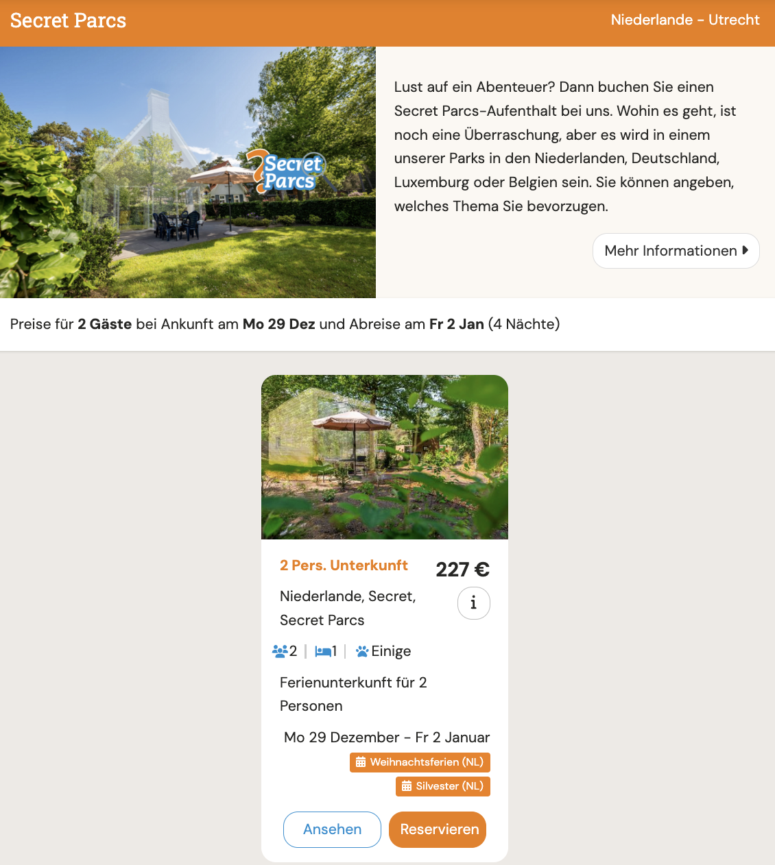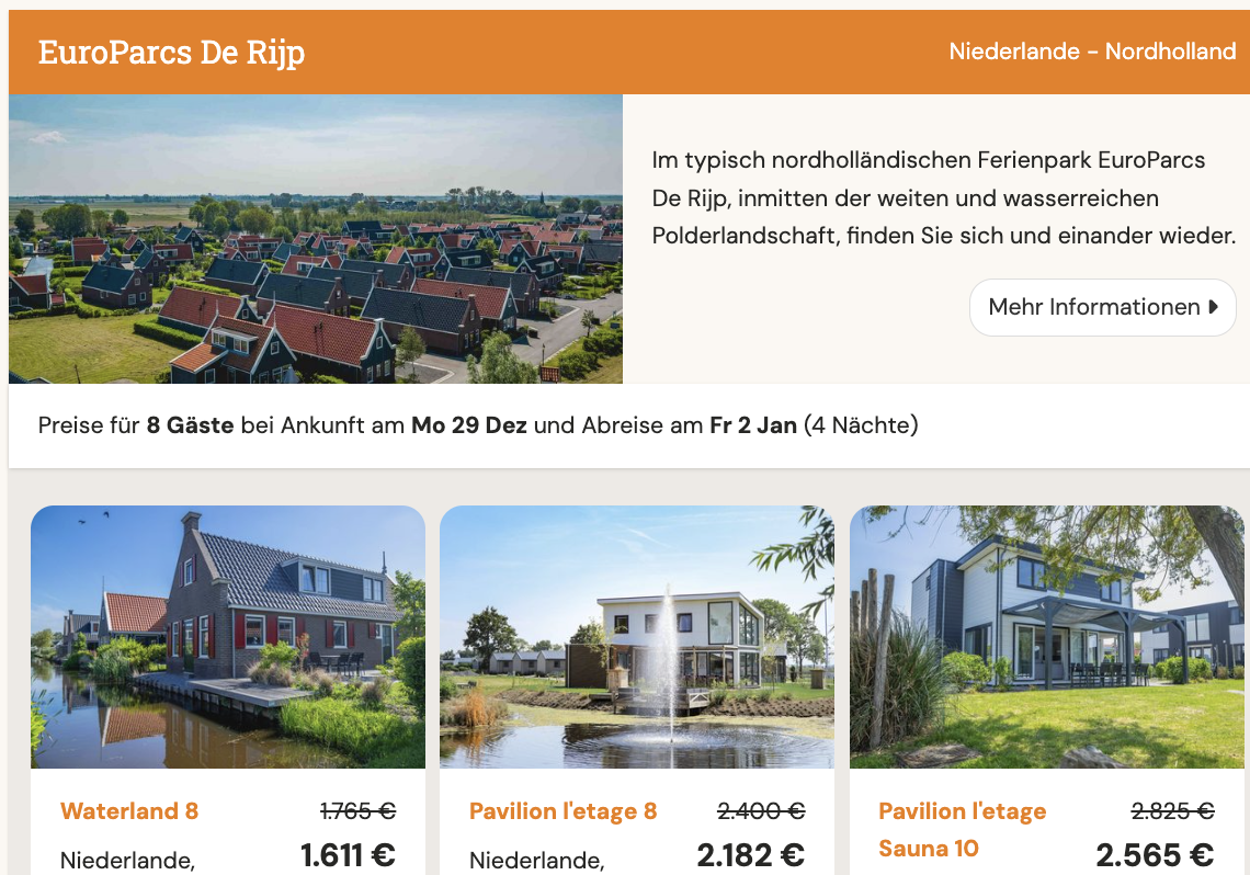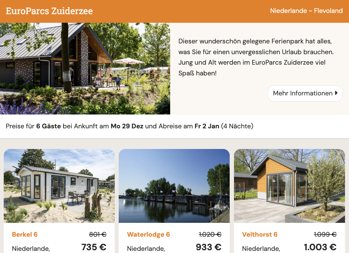 Um euch die Suche ein bisschen zu vereinfachen, haben wir euch weiter unten Ferienhäuser für 2 bis zu 16 Personen in den Niederlanden verlinkt.👇 Die Ferienparks punkten u.a. mit einem Hallenbad. Für 4 Nächte im Ferienhaus zu sechst zahlt ihr z.B. nur 122€ pro Person. Endreinigung, Bettwäsche und Kurtaxe sind bereits inkludiert. ✅