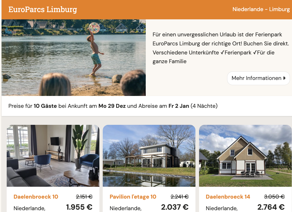 Ob in kleiner oder großer Runde – bei EuroParcs findet ihr vergleichsweise günstige Ferienhäuser in tollen Ferienparks in den Niederlanden, Belgien, Luxemburg, Deutschland und Österreich.