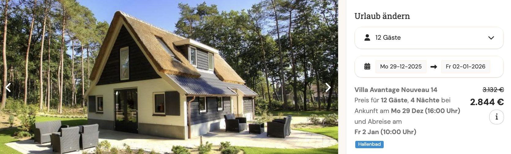 Die Ferienparks punkten u.a. mit einem Hallenbad. Für 4 Nächte im Ferienhaus zu sechst zahlt ihr ab nur 104€ pro Person (627€ Gesamtpreis). Endreinigung, Bettwäsche und Kurtaxe sind bereits inkludiert. 🥳