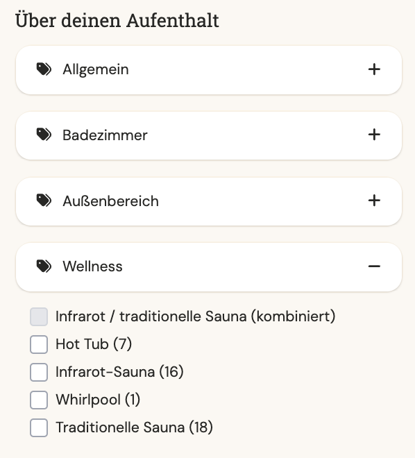 ℹ️ Nach der Weiterleitung könnt ihr auf der linken Seite unter "Sport & Aktivitäten" z.B. Hallenbad, Indoor-Spielplatz oder Wellnessmöglichkeiten (ganz unten) auswählen. Unter "Über euren Aufenthalt" wählt ihr aus, wenn euer Ferienhaus z.B. eine eigene Sauna haben soll.