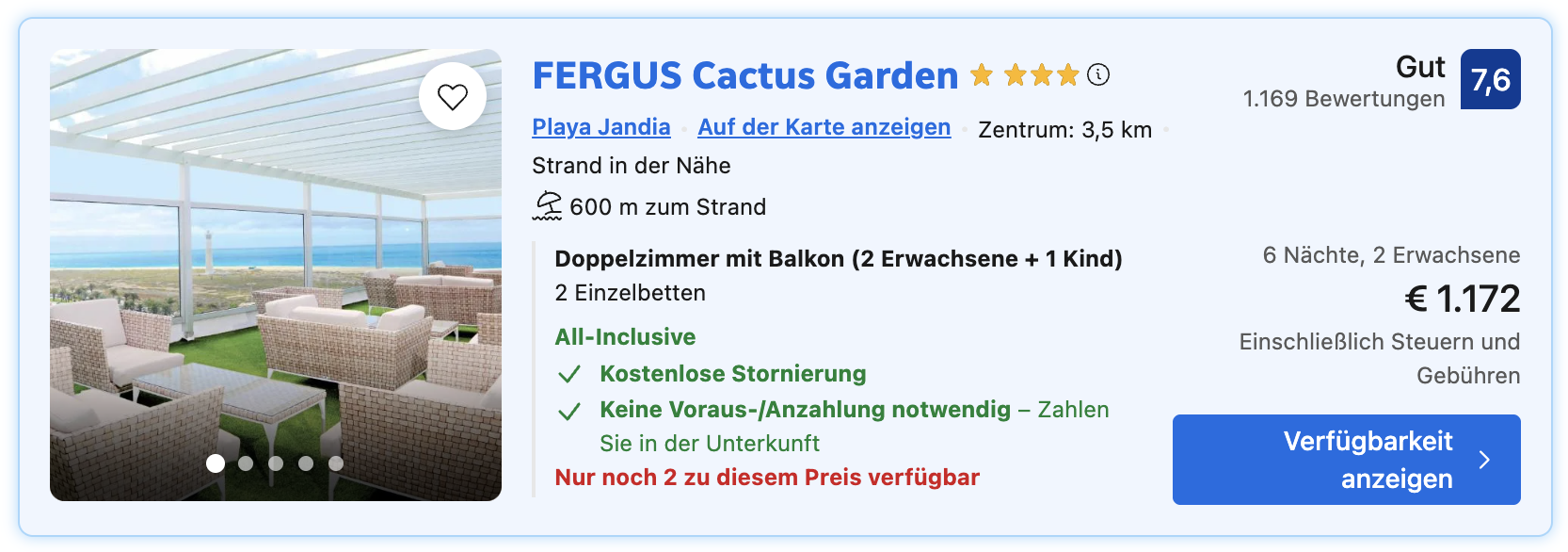 Wir haben uns bei diesem Beispiel explizit gegen das Angebot mit Flug entschieden, da ihr häufig die Flüge getrennt gebucht, weitaus günstiger bekommt und somit nochmal enorm sparen könnt. Lasst euch einfach weiterleiten und checkt euer Wunschdatum aus.
