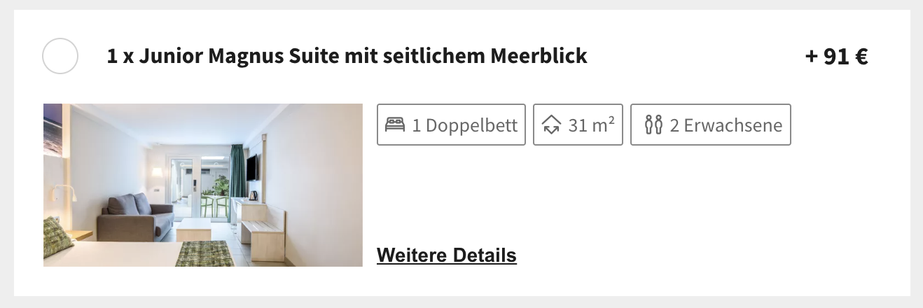 Wollt ihr's etwas luxuriöser? Dann könnt euch die Junior Magnus Suite mit Meerblick für gerade mal 45,50€ Aufpreis p.P. für die gesamte Woche.
