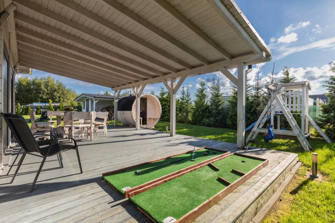 Im Außenbereich erwartet euch eine Terrasse mit Grillmöglichkeit, ein Spielplatz für Kinder und Minigolf-Bahnen. Entspannung garantiert die Sauna.