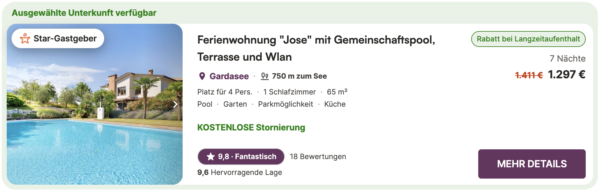 Eine Woche bekommt ihr zu viert ab nur 325 € pro Person. Kostenlos stornieren könnt ihr bis eine Woche vor Anreise.