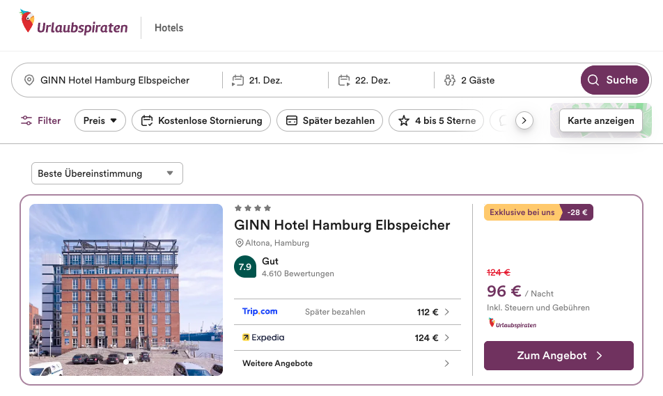 Und um die City rundum zu erkunden, benötigt ihr ein Hotel in top Lage und da kommt dieser Deal wie gerufen. Denn eine Übernachtung zum Beispiel im Dezember im 4* GINN Hotel Hamburg Elbspeicher kostet euch nur ab 48€ pro Person. Gegen Aufpreis könnt ihr auch das Frühstück dazubuchen.