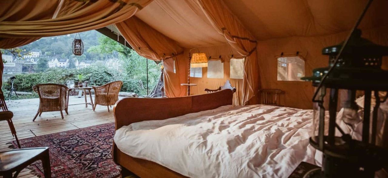 In Traben-Trabach, einem kleinen hübschen Städtchen an der Mittelmosel, liegen viele historische und edle Häuser. Das luxuriös ausgestattete Safari-Zelt liegt zwischen zwei solcher Villen direkt am Moselufer. Genauer in einem exklusiven Gartenteil, den ihr ganz für euch alleine habt. Von Mitte Mai bis Mitte Oktober könnt ihr dort im Safari-Zelt übernachten. Ihr schlaft in einem gemütlichen und komfortablen Kingsize-Bett. Zur Unterkunft gehört außerdem ein Open-Air-Badezimmer mit einer alten Stahlbadewanne und Dusche. Auch die Dusche ist besonders. Wenn das Wasser fließt, steht ihr auf einem alten Eichendeckel eines antiken Weinfasses.