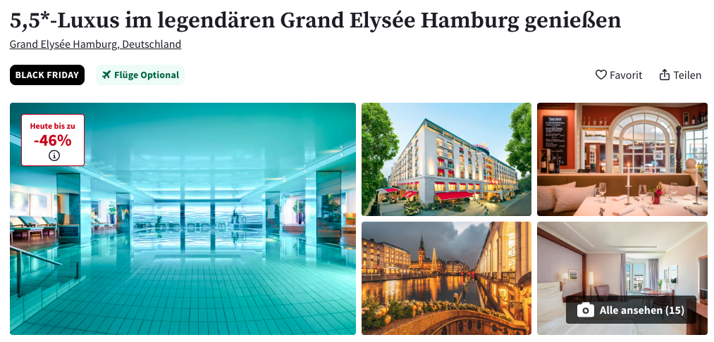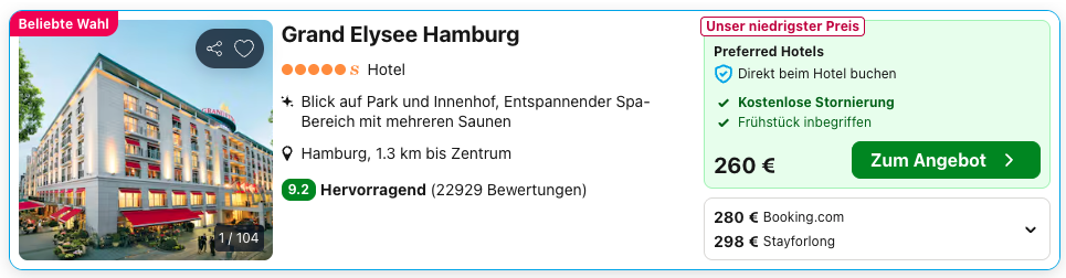 Die passende (und zugegebenermaßen sehr luxuriöse) Unterkunft servieren wir euch mit diesem Deal. Für eine Übernachtung im hervorragend bewerteten 5,5* Grand Elysée Hamburg zahlt ihr ab 89,50€ pro Person. Dabei kommt ihr im Grand-Classic-Doppelzimmer unter und das Frühstück sowie weitere Extras sind bereits enthalten.