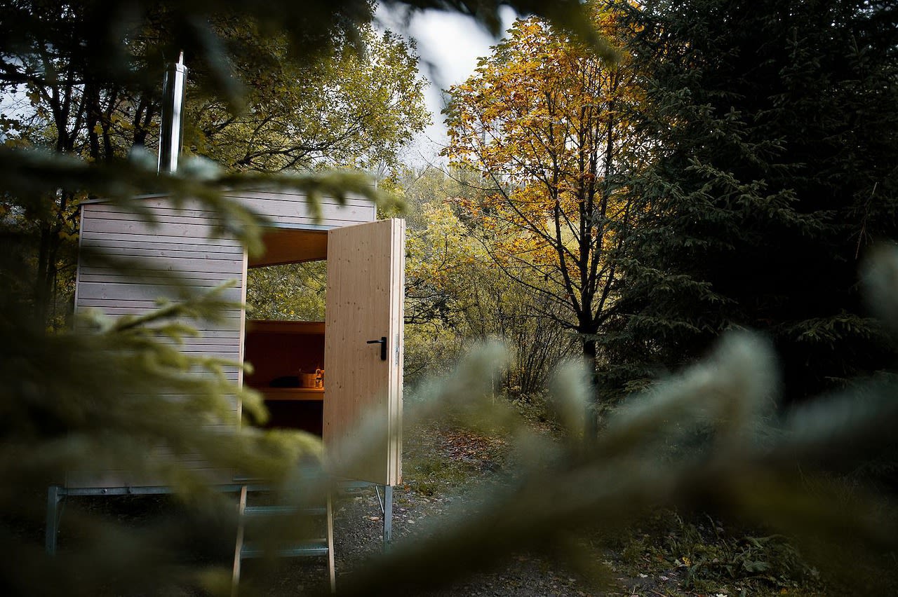 Zum Green Tiny Village Harz gehören weiterhin natürlich Duschen und WCs, eine Feuerstelle, ein Spielplatz sowie eine Boulderwand, ein kleiner See und außerdem die neue Tiny Sauna mit finnischem Holzofen.