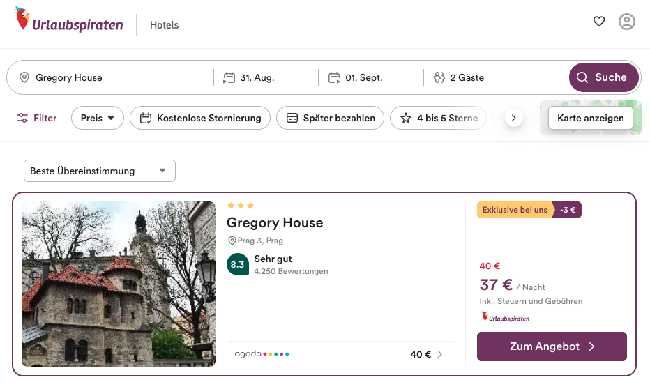 Bereits ab 18,50€ pro Person (37€ Gesamtpreis bei einer Reise zu zweit) könnt ihr nämlich in Prag übernachten. Das 3* Hotel Gregory House liegt dabei verkehrsgünstig und zentrumsnah und ist darüber hinaus auch sehr gut bewertet (u.a. 8,6 von 10 bei Booking).