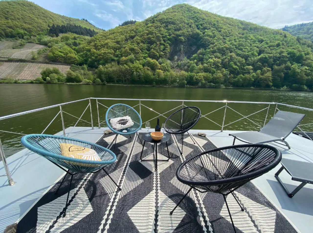 Das Hausboot Moseltraum liegt, der Name verrät es bereits, in der Mosel. Dort könnt ihr auf dem Oberdeck Sonne tanken oder auf der Terrasse den Grill anschmeißen. Außerdem könnt ihr vom Hausboot aus aufbrechen, um die Region zu erkunden, sogar einige Weingüter sind zu Fuß zu erreichen. Im Inneren erwarten euch zwei Schlafkojen, ein Badezimmer und ein Wohnbereich samt Küche.