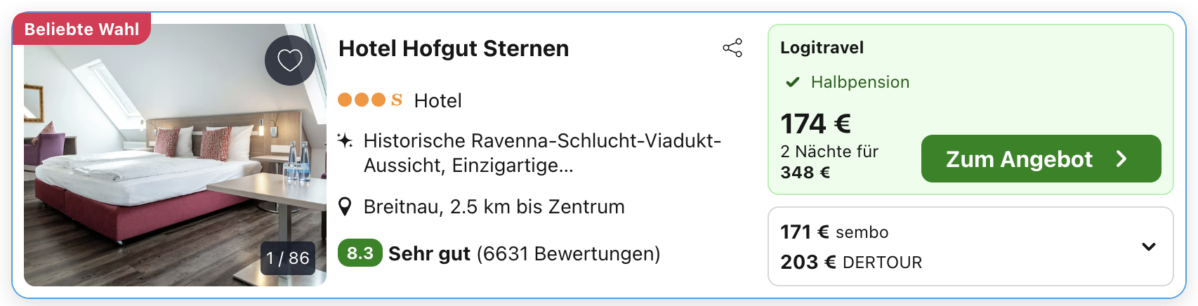 Wir haben als Beispieldatum einen Aufenthalt vom 15. - 17. November geprüft. Während ihr auf anderen Portalen 174 € inkl. Halbpension zahlt, sind es bei unserem Deal hier nur 149 €.
