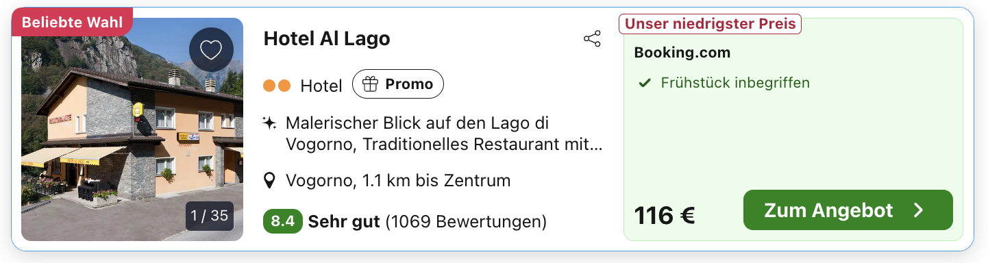 🏨 Zu bezahlbaren Preise übernachten könnt ihr schon in zehn Minuten Entfernung: Dort liegt der Lago di Vogorno, an dem wir das gemütliche Hotel Al Lago entdeckt haben. Das Doppelzimmer mit Frühstück und Seeblick kostet euch hier im billigsten Reisemonat 58 Euro pro Person pro Nacht (wenn ihr einen Genius-Status bei Booking habt, sogar nur 52 Euro).