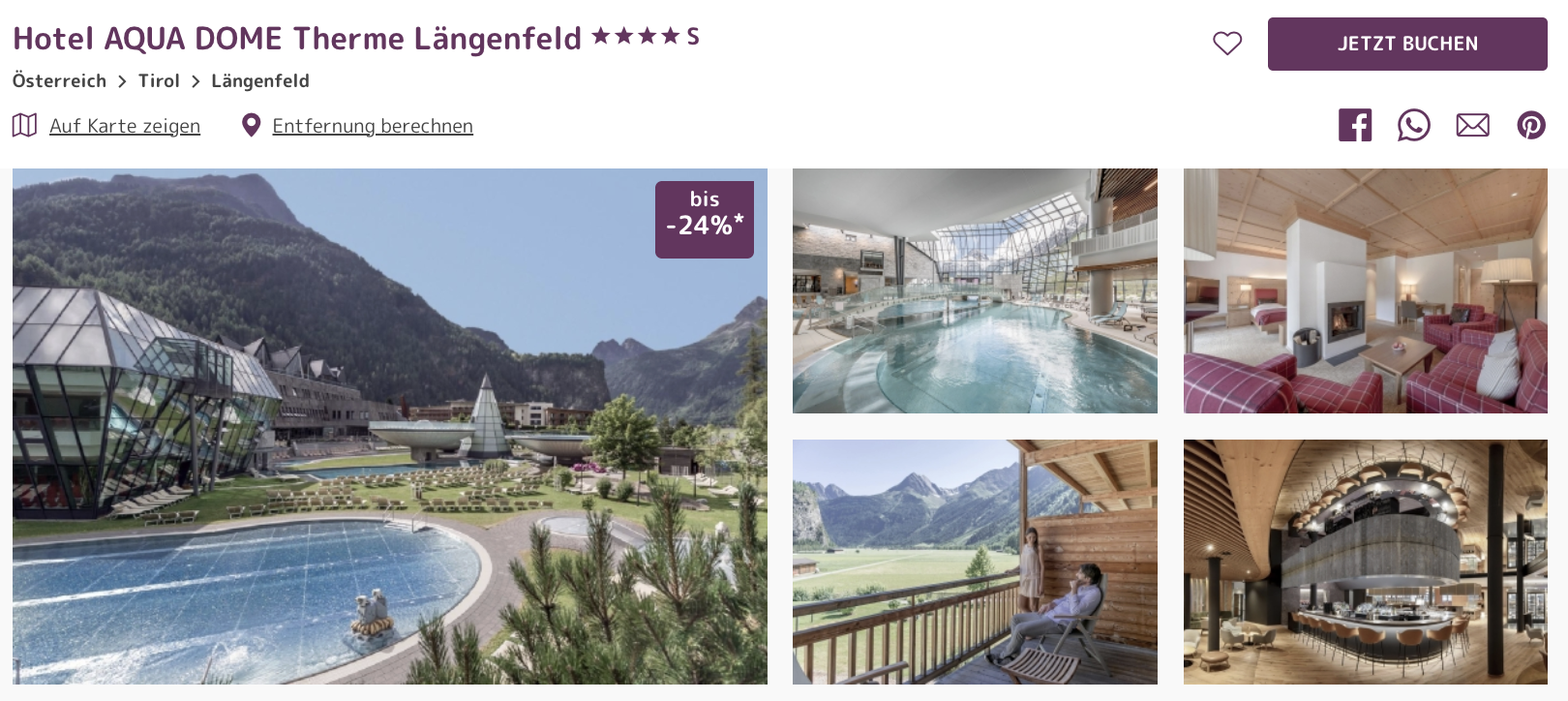 Es geht nach Längenfeld ins top 4*S Hotel AQUA DOME Therme, wo euch eine Übernachtung inklusive den bereits erwähnten Leistungen ab 224 € pro Person kostet.