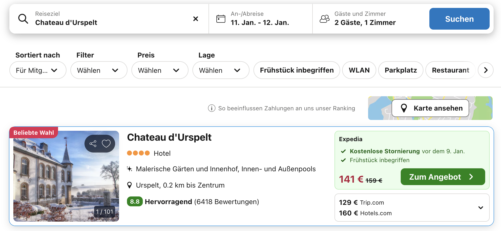 An unsrem Beispieltermin konnten wir den besten Preis bei Trip finden. Klickt bei Trivago auf weitere Preise und lasst euch direkt dorthin weiterleiten.