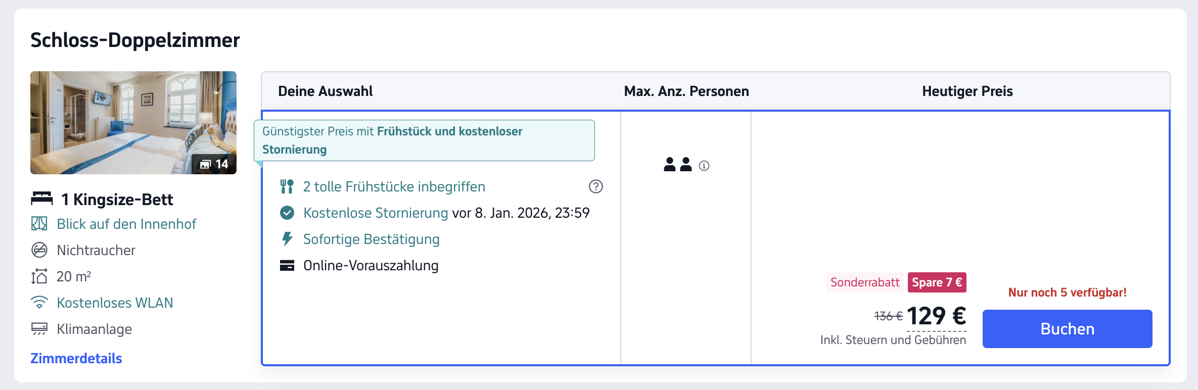 Wenn ihr also mal etwas luxuriöse Schloss-Luft zum kleinen Preis schnuppern wollt, seid ihr hier genau richtig. Denn die Nacht im Doppelzimmer bekommt ihr ab 65 € pro Person und das Frühstück ist ebenfalls inklusive!