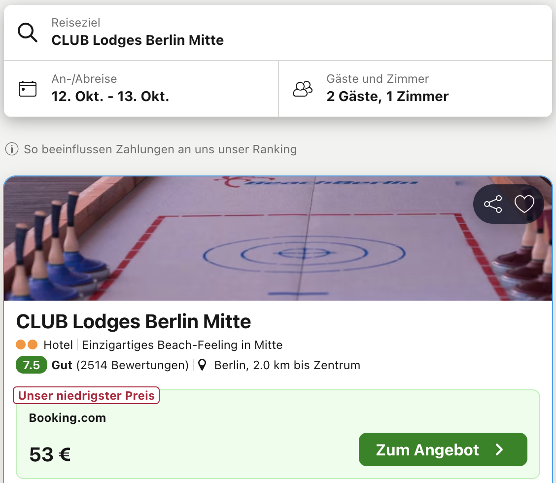 Somit zahlt ihr für die Nacht von Sonntag auf Montag nur rund 27€ pro Person.