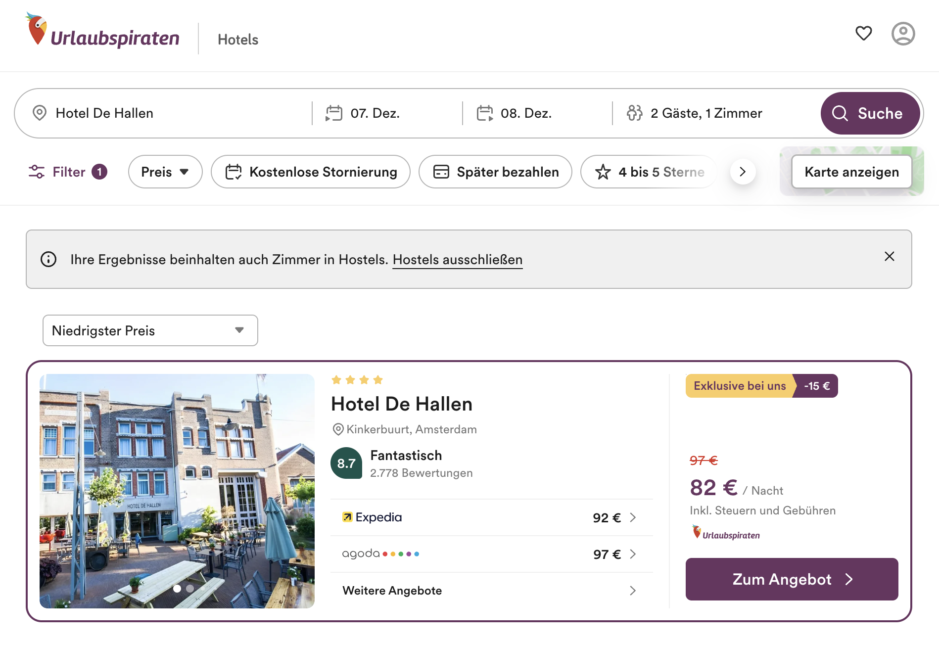 Eine Übernachtung in dem Hotel gibt's aktuell ab um die 40 € pro Person. Anreisen könnt ihr beispielsweise mit der Bahn, Tickets gibt's schon ab 20€ pro Strecke, je nach Datum. In unserer Beispielverbindung zahlt ihr für die Übernachtung + An- und Abreise mit der Bahn zu top Zeiten 89€ pro Person.