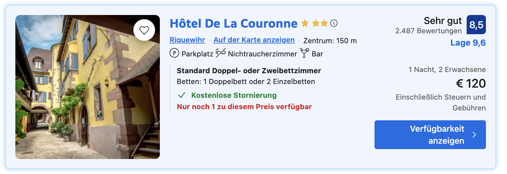 An unsrem Beispieltermin konnten wir den besten Preis bei Booking finden. Lasst euch also von Trivago direkt dorthin weiterleiten.