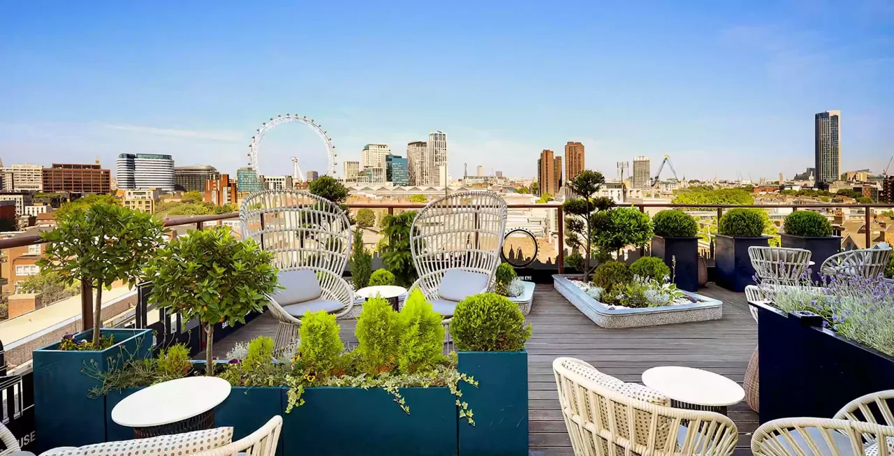Ein Highlight des Hotels ist die grandiose Dachterrasse mit einem 360°-Blick über Londons Skyline. Ob bei Sonnenuntergang, abends mit Lichtern oder tagsüber mit Blick auf die Klassiker der City – hier entstehen Erinnerungen, die bleiben.