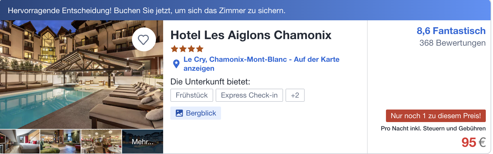 Ahoi Piraten! Mit diesem Angebot geht es für euch an den Fuße des Mont Blanc, dem höchsten Berg der Alpen. Dort übernachtet ihr jetzt für gerade einmal 48€ pro Person (bei einer Reise zu zweit) im stylischen und sehr gut bewerteten 4* Hôtel Les Aiglons in Chamonix. Überzeugen kann dort auch die zentrale Lage sowie der Außenbereich mit beheiztem Pool und Whirlpool.