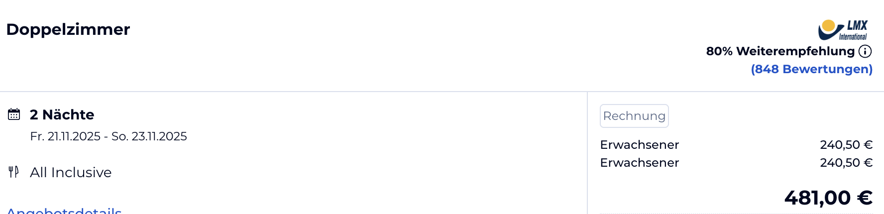 Bei einem Aufenthalt vom 21. - 23. November zahlt ihr mit diesem Angebot nur 219€ pro Person. Bei anderen Anbietern werden mindestens 240,50€ pro Reisenden fällig.