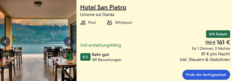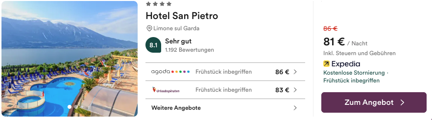 ℹ️ Beachtet, dass in diesem Deal die Anreise noch nicht inkludiert ist. Ihr erreicht den Gardasee aber easy mit dem Auto. Alternativ könnt ihr nach Verona oder Mailand fliegen.