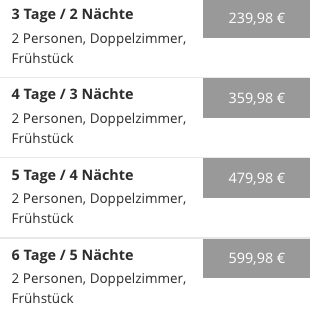 Bei diesem Angebot kosten euch zwei Übernachtungen nur 120€ pro Person, zum Beispiel bei einem Aufenthalt vom 4. - 6. April (Ostern). Bucht ihr woanders, werden 185€ pro Person fällig. Macht eine Ersparnis von 35 Prozent.