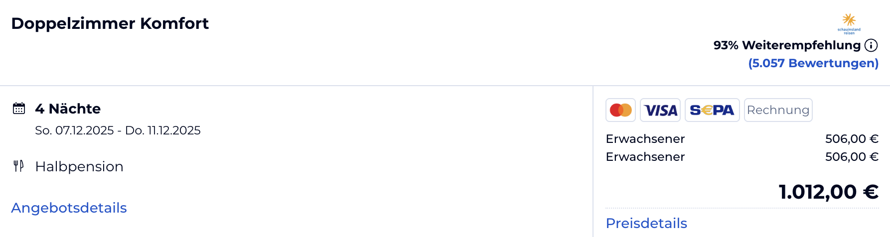 Reist ihr vom 07.-11.12.2025 an, zahlt ihr bei anderen Anbietern bereits 506 € pro Person. Bei unserem Deal sind es nur 299 € pro Person. Macht eine Ersparnis von über 200 € pro Person!