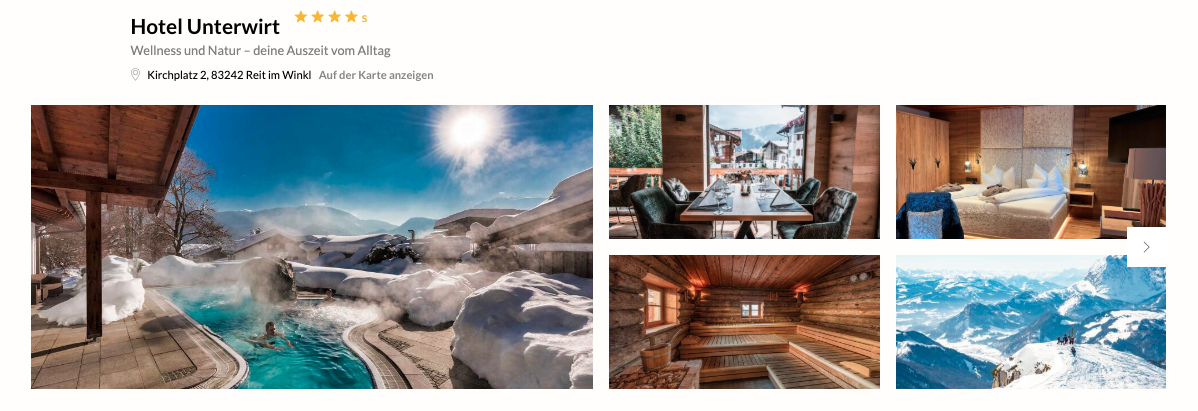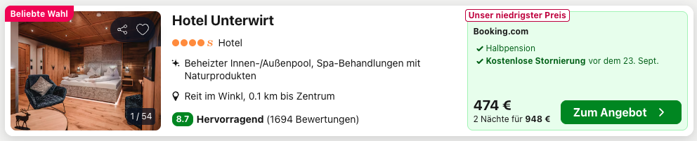 Mitten in dem beliebten Urlaubsort Reit im Winkl befindet sich das hervorragend bewertete 4*S Hotel Unterwirt, das mit einem tollen Wellnessbereich inklusive beheiztem Außenpool auftrumpft. Ein entspannter Kurzurlaub mit zwei Übernachtungen kostet euch aktuell lediglich 219€ pro Person bei der Reise zu zweit. Enthalten sind jede Menge Extras, wie zum Beispiel die tägliche Halbpension, Zugang zum Wellnessbereich auch am Abreisetag und vieles mehr.