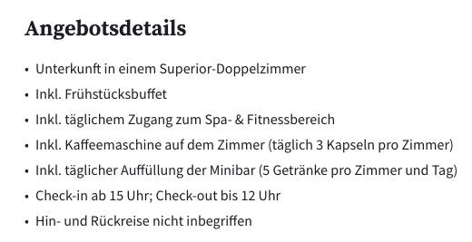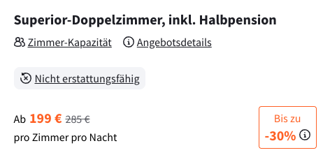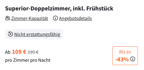 Wir haben verglichen, damit ihr guten Gewissens buchen und somit sparen könnt. Woanders kostet der Beispieltermin mit Anreise am 1. November gleich mal mindestens 134€ pro Person inkl. Frühstück, bei diesem Deal zahlt ihr hingegen nur 54,50€ pro Person. Ersparnis: tolle 59%!
