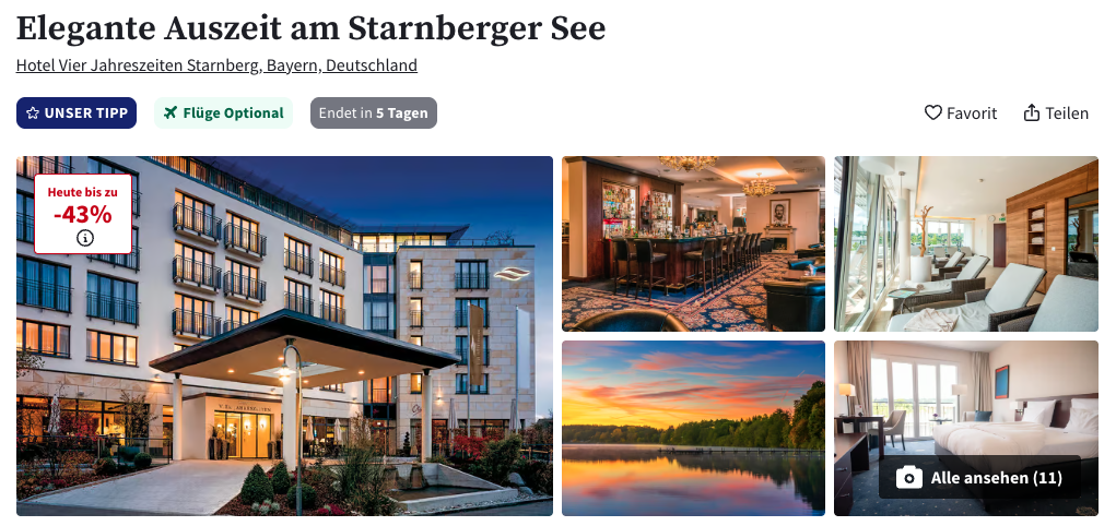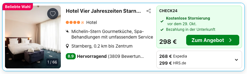Die passende Unterkunft dafür servieren wir euch mit diesem Deal. Für die Übernachtung im 4*S Hotel Vier Jahreszeiten Starnberg zahlt ihr nur ab 54,50€ pro Person. Ihr genießt weiterhin das Frühstück und bekommt kostenfreien Zugang zum Wellness- und Fitnessbereich. On top gibt es die tägliche Auffüllung der Minibar für euch! Zudem könnt ihr im Vergleich zu anderen Buchungsportalen gut was sparen (siehe Preisvergleich unten).
