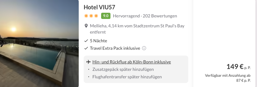5 Nächte im Hotel VIU57 inklusive Flügen, zum Beispiel ab Köln, gibt es aktuell schon ab 149 € pro Person – ein wirklich bemerkenswerter Preis.