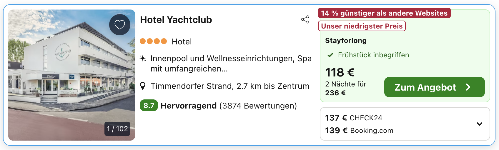 Bei Travelcircus zahlt ihr jetzt ab nur 75€ p.P., zum Beispiel vom 22. - 24. Februar 2026. Auf anderen Portalen beträgt der Preis hingegen mindestens 118€ pro Person.