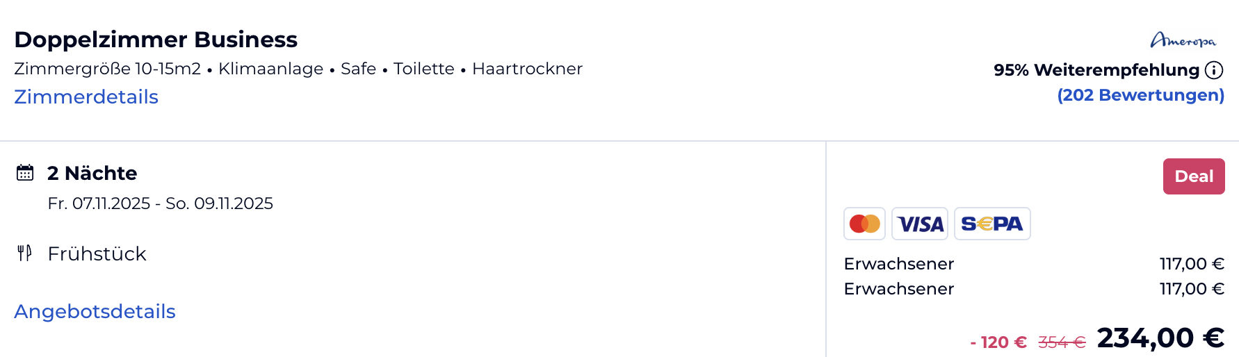 Bei einem Aufenthalt vom 7. - 9 November bezahlt ihr bei unserem Deal gerade mal 99 € pro Person inkl. Frühstück, während ihr bei anderen Anbietern schon 117 € pro Person bezahlt.