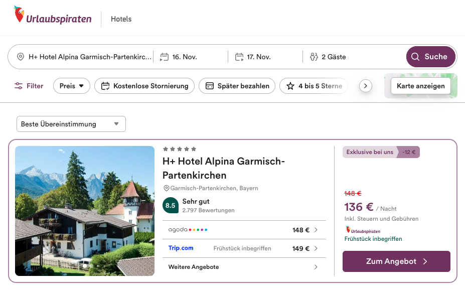 Es geht nach Garmisch-Partenkirchen im Schatten der Zugspitze. Dort gibt's die Übernachtung in dem gehobenen H+ Hotel Alpina Garmisch-Partenkirchen (vormals HYPERION Hotel Garmisch-Partenkirchen) bereits für weniger als 70€ pro Person inklusive Frühstück.