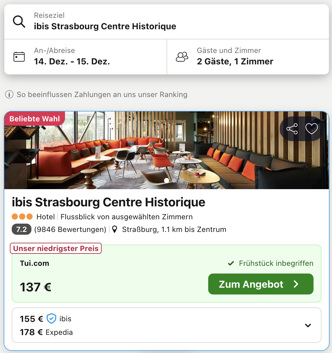 An unsrem Beispieltermin gibt es den günstigsten Preis für 137€ bei Tui.com. Somit zahlt ihr nur rund 69€ p.P. Das Frühstück ist auch schon mit dabei.