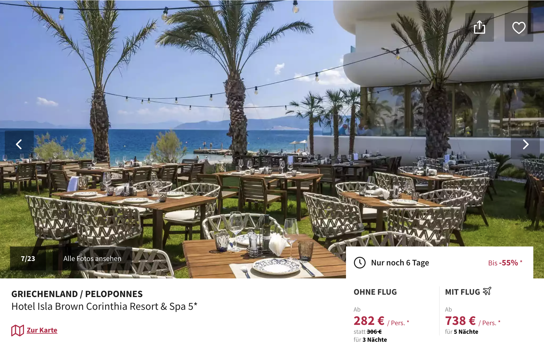 Griechenland hat angerufen! Geht ihr ran? Denn es geht nach Peloponnes, ins 5* Isla Brown Corinthia Resort & Spa direkt am Strand und unweit vom legendären Korinth-Kanal (wo ihr übrigens auch von einer Brücke Bungee Jumping machen könntet, falls ihr auf Nervenkitzel steht 😎). On top seid ihr auch nur 15min zu Fuß vom Bahnhof entfernt, wo euch der Zug direkt nach Athen in unter einer Stunde bringt. Ihr seid also sowohl mit als auch ohne Mietwagen dort sehr gut angebunden.