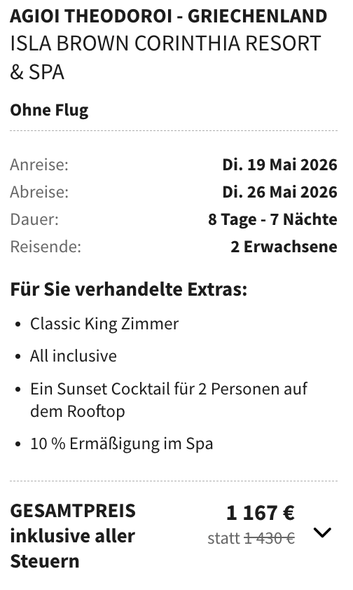 Wir haben uns bei diesem Beispiel explizit gegen das Angebot mit Flug entschieden, da ihr häufig die Flüge getrennt gebucht, weitaus günstiger bekommt und könnt somit nochmal enorm sparen könnt. Lasst euch einfach weiterleiten und checkt euer Wunschdatum aus.