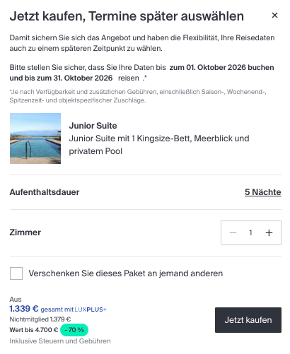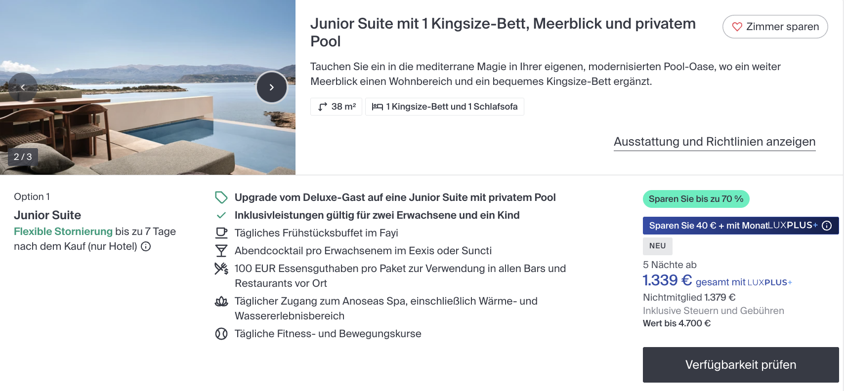 Bei anderen Buchungsportalen zahlt man in dem Zeitraum aktuell mind. 1.820€ bzw. 1.552,07 Euro pro Person für die gleiche Zimmerkategorie einschließlich Frühstück.