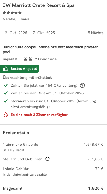 Das brandneue 5* JW Marriott Crete Resort & Spa hat erst im Juni diesen Jahres eröffnet und bringt frischen Glanz an die Nordküste Kretas – und das im allerfeinsten Stil ✨. Eingebettet in die traumhafte Landschaft ganz in der Nähe von Chania, erwartet dich hier ein echtes Luxusrefugium mit stylischen Suiten, Private Pools und erstklassigem Service – perfekt für alle, die Design, Ruhe und Natur lieben 💆♀️🌿.