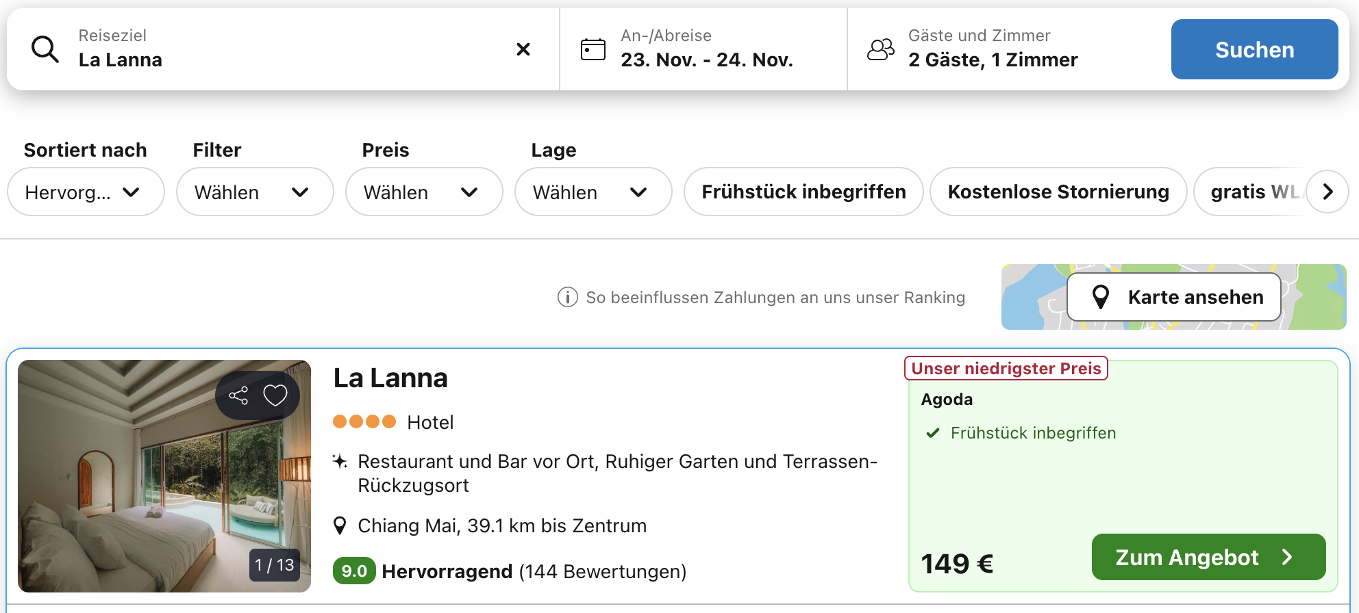 Gerade für solche außergewöhnlichen Unterkünfte sind die Hotelpreise in Südostasien meist ziemlich hoch. Doch dieser Aufenthalt im La Lanna bei Chiang Mai ist ein echtes Highlight: